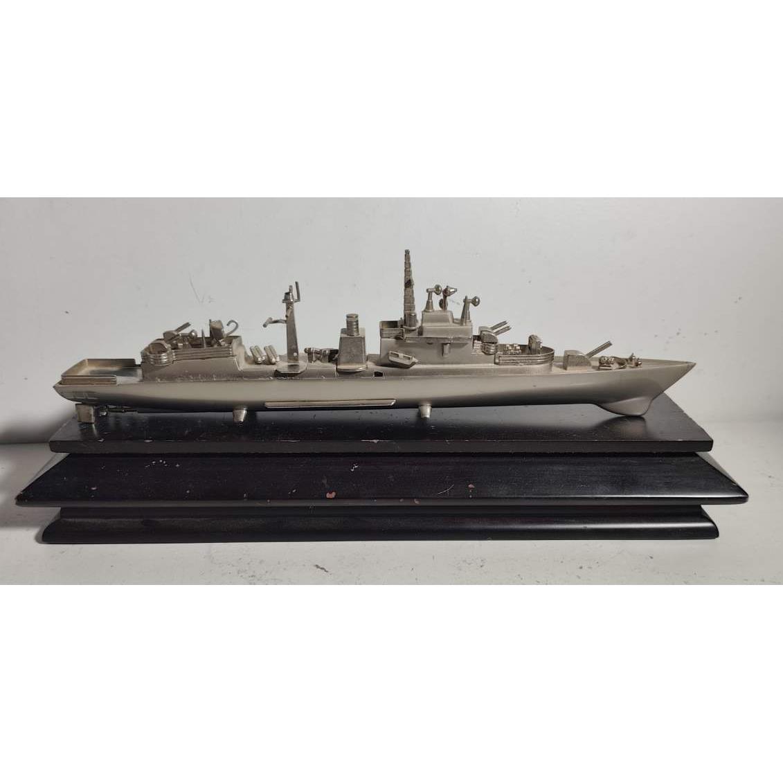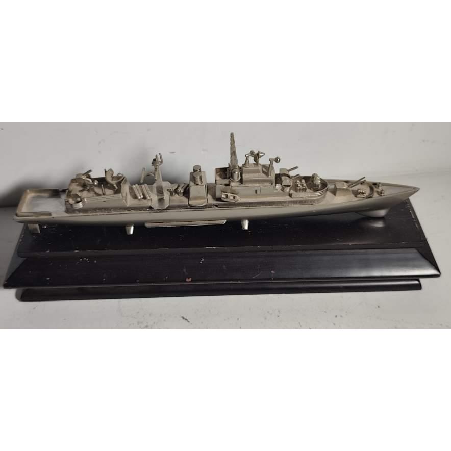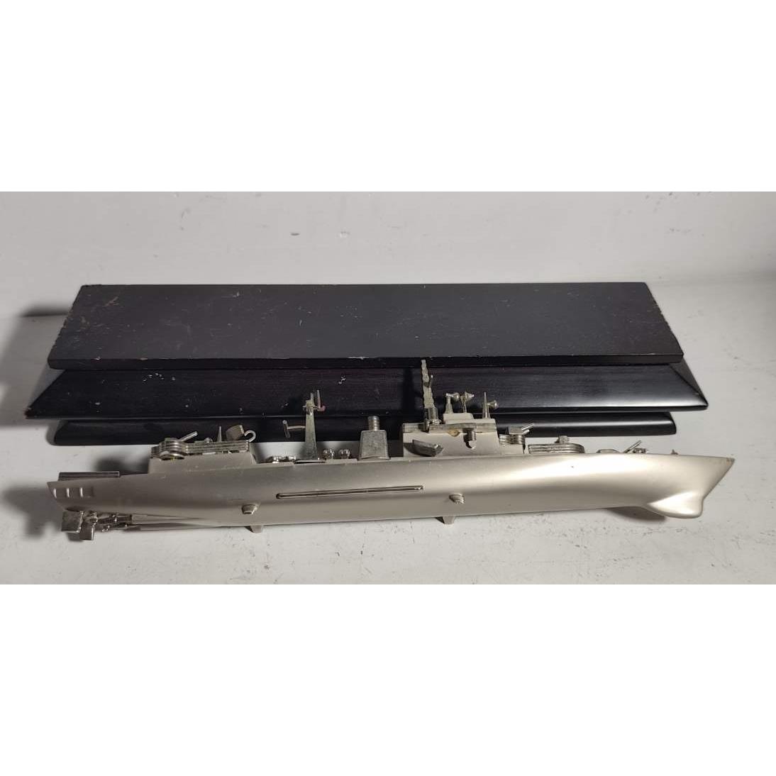 Buque de guerra a escala en metal sobre base de madera (medidas 37 cm de largo , medida de base en madera 40 x 11cm)