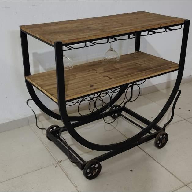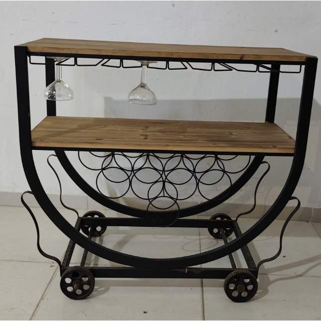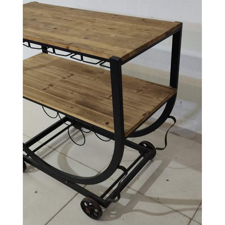 Mesa de servicio tipo bar en hierro y madera de dos niveles con porta copas y porta botellas(82 x 39 x 64 de alto)
