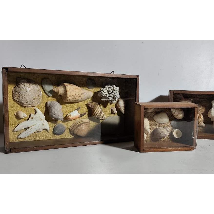4 Cajitas decorativas en madera y vidrio con caracoles, conchas marinas , corales y otros (mas grande 32.5 x 17 de alto x 8 de prof)