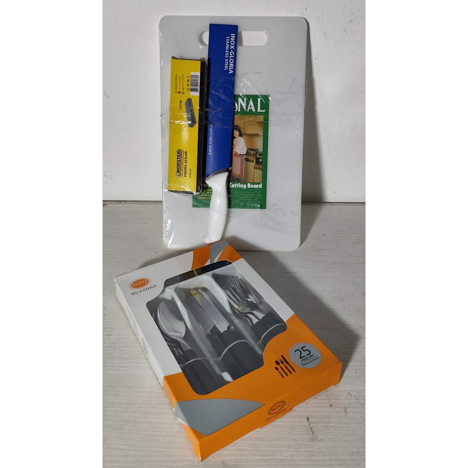 Set de 24 cubiertos, tabla, cuchilla y piedra para afilar